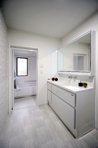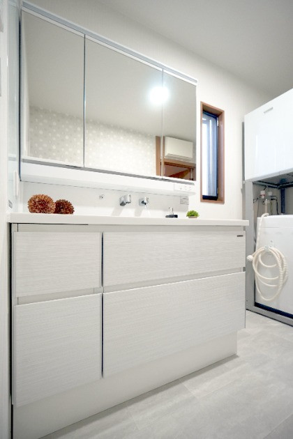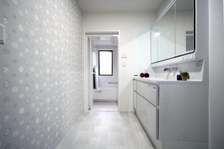洗面の内装は奥様と娘様がこだわられ、壁に使用したグレーのボタニカル柄のアクセントクロスがかわいらしく、やさしい雰囲気を演出しています。
