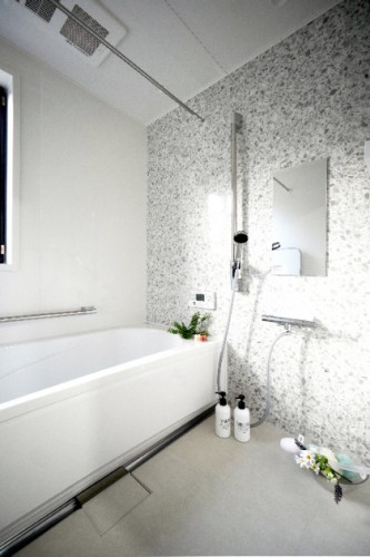 浴室正面の壁には、アクセントとして石目柄のデザインを選ばれました。