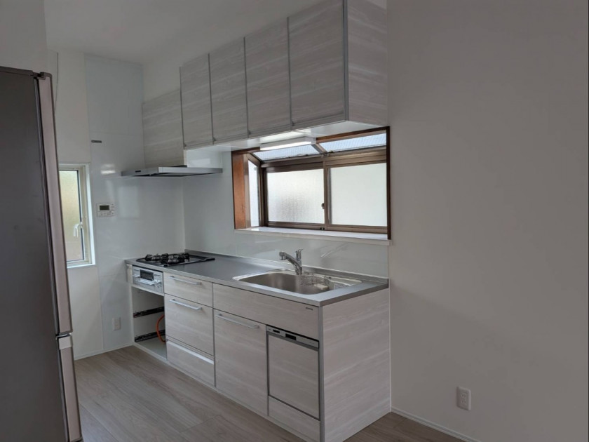 既存のキッチン収納棚を撤去し、空間全体を広く使えるように。広々とした空間になりました。新たに設置したキッチンは、機能性、収納力に優れたトレーシアを採用。使い勝手の良いレイアウトにより、日々の家事導線もスムーズになりました。