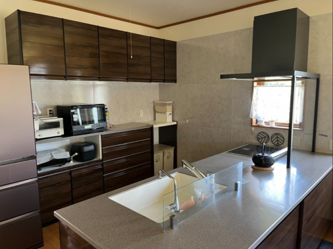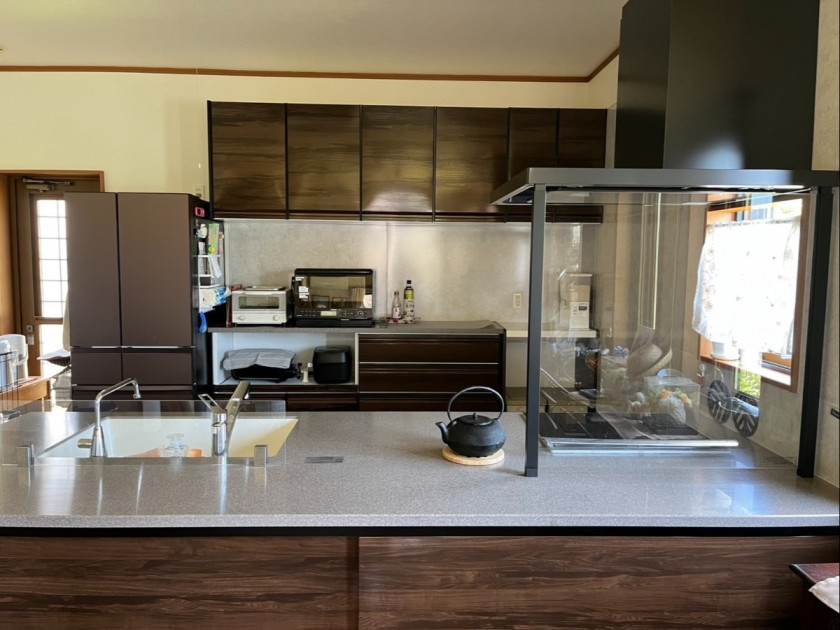 モダンなキッチンに数日でリフォーム。作業スペースも広く、家族やゲストと会話を楽しみながら料理ができる開放感のある空間。換気フードや照明も一新しました。