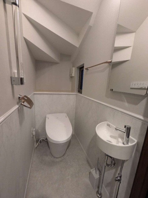 すっきりしたタンクレストイレに取替え、手洗器を新たに設置。腰パネルもつけ、清々しい内装になりました。