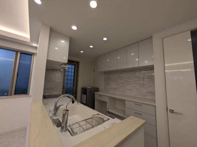 白を基調に洗練されたキッチンになり、照明もダウンライトに変えました。