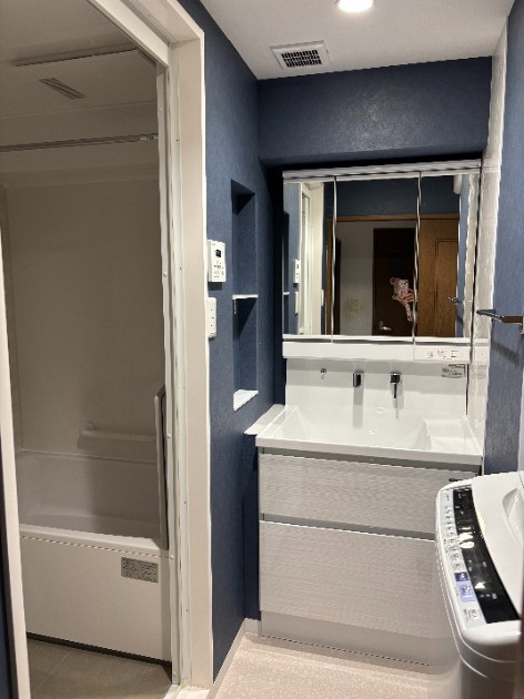 奥様のご希望により、濃紺のクロスを使い、カタログに載っているようなオシャレな空間に仕上げた。
