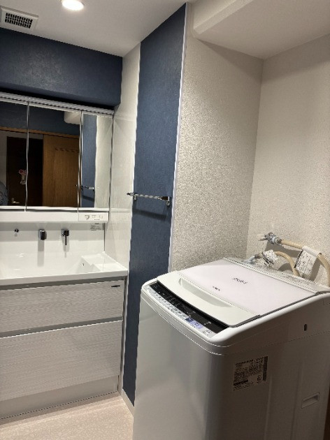 洗面化粧台の設置位置をずらし、壁面に収納棚と