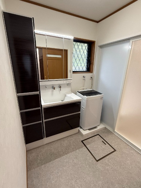 洗面室のクロスも綺麗になって壁のスイッチや割れていた床の見切も取り替えていただいて、新しい空間に生まれ変わりました。