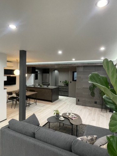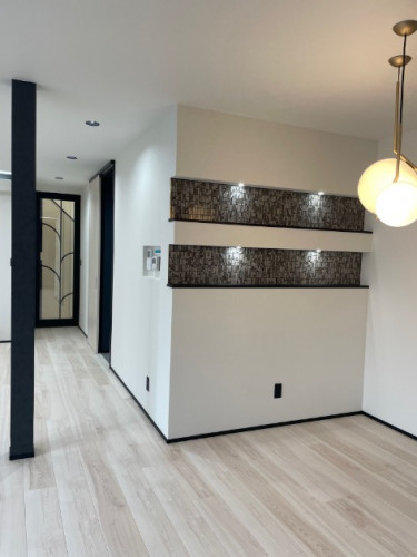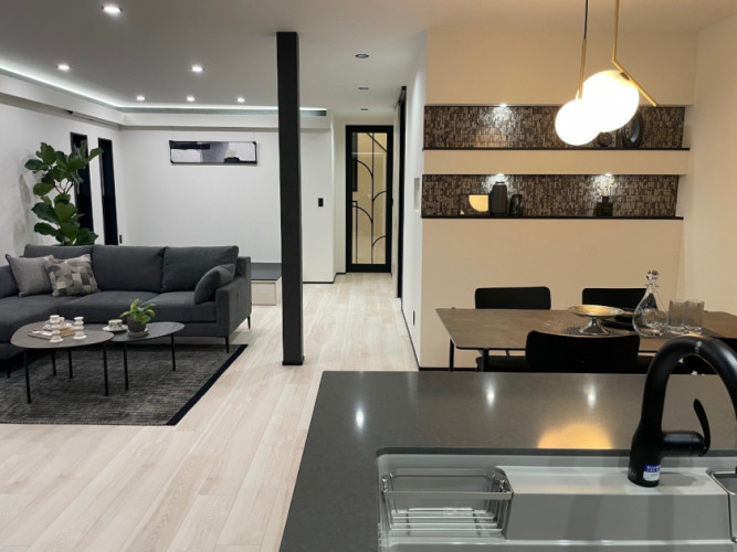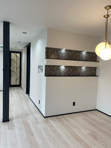 ご主人のご要望である“ホテルライクな暮らし”を実現するため、天井周囲に間接照明を計画。キッチン側の空間はブラックで統一し、リビング側はホワイトでまとめることで、モノトーンインテリアを際立たせました。素材の組み合わせにもこだわり、洗練された雰囲気を演出しています。