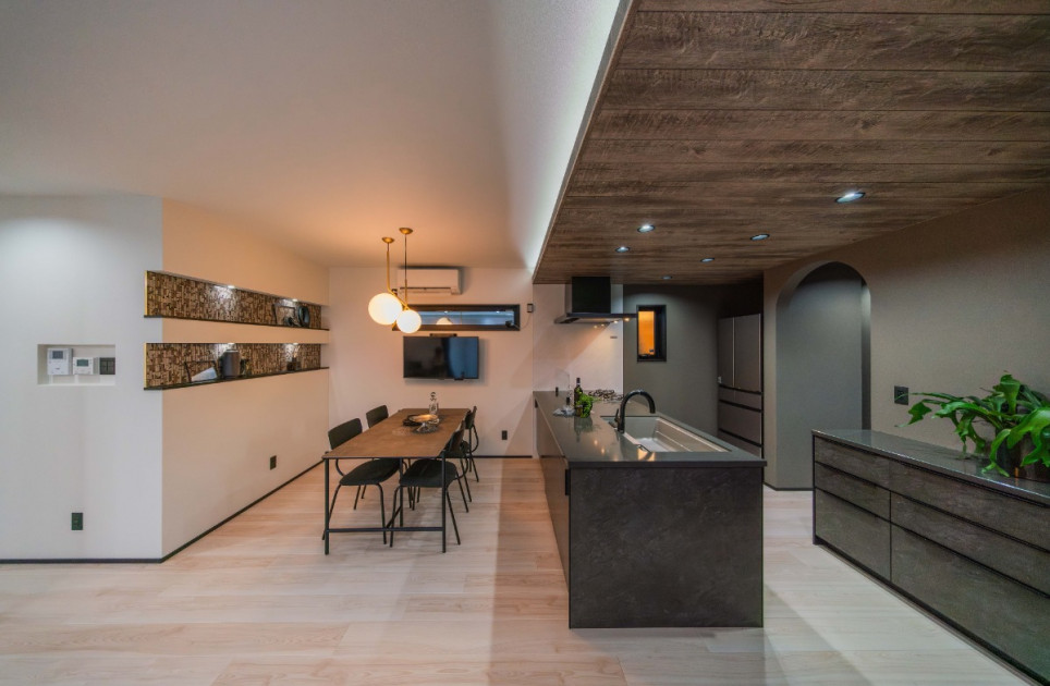 窓のサイズや位置を見直し、光と風を取り込みやすく改善。キッチン背面にはR壁から続く大容量パントリーを計画し、ダイニングにはタイルと照明付きのニッチを設けて、使いやすさとオシャレを兼ね備えた空間に仕上げました。