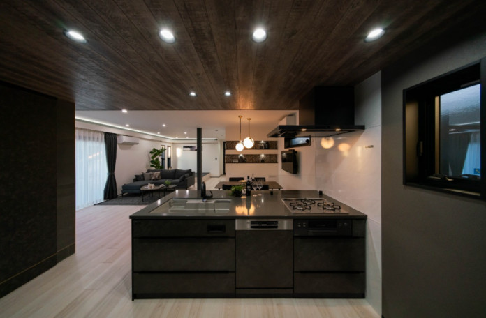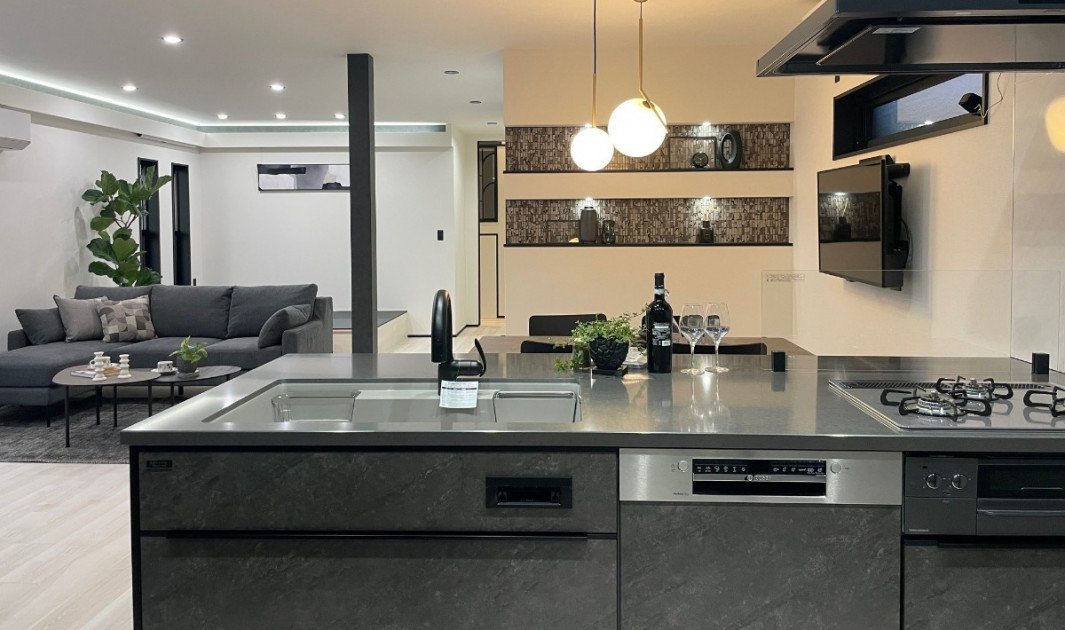 アイランドキッチンと背面の大容量パントリーで収納力と家事効率を両立。料理をしながら家族との会話が弾み、自然と集まる空間に。折上げ天井や間接照明でホテルライクな上質さも備え、デザインと快適性を兼ね備えたLDKとなりました。