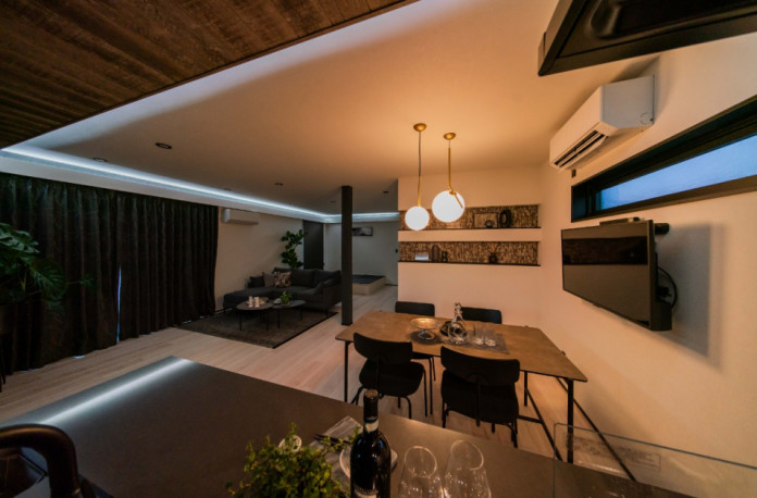 和室をなくして実現した広々LDK。夜になると天井際に仕込んだ間接照明が空間をやわらかく包み込み、ラグジュアリーで大人なひとときを演出します。