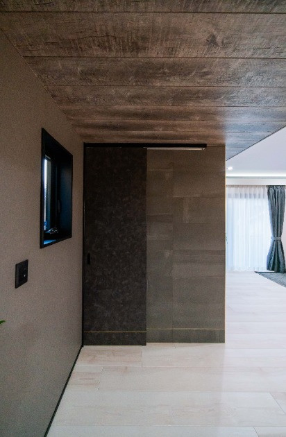 書斎の入口は、ゴールドの見切りを扉と壁の足元で揃えることで、まるで隠れドアのように空間に溶け込みました。細やかなデザインの工夫が、機能性と遊び心を両立しています。