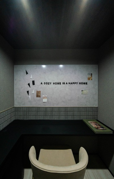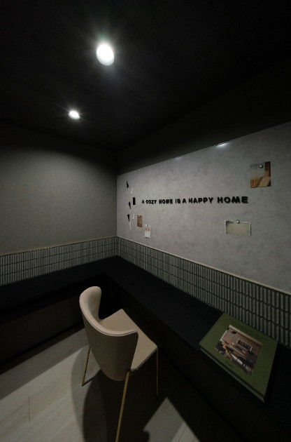 L字型のデスクには、指紋が付きにくい黒のメラミンを採用。エマウォールにはコンクリートライトを選び、空間全体をグレーで統一しました。さらにタイルとの見切りにはゴールドを取り入れ、上質なアクセントに。細部の納まりにまでこだわることで、実用性とデザイン性を兼ね備えた、洗練されたワークスペースに仕上げています。