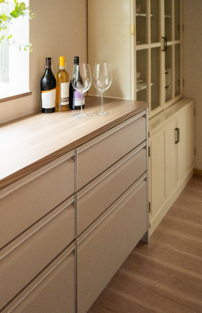横に並ぶのは、奥様が40年前に購入された思い出の食器棚。長らく本棚として使われていましたが、この機会に再び食器棚として活躍の場を得ました。