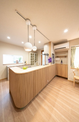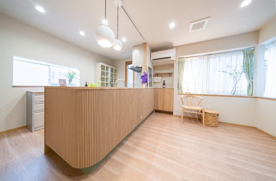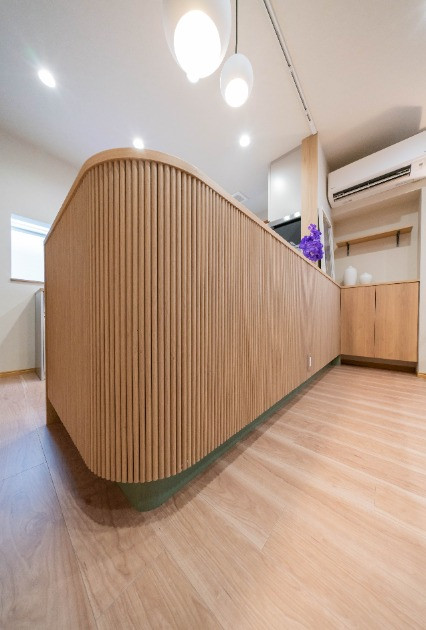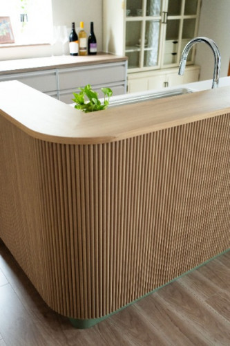 角をアールにすることで柔らかさを表現し、リブボードが繊細な表情をプラス。インテリアの主役となるキッチンカウンターに仕立てました。