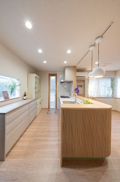 対面キッチンの背面には家電収納と食器棚を配置し、吊戸をあえて付けずにオープンで開放的に。広々とした通路で配膳や片付けもしやすく、家事動線もスムーズ。見た目の美しさと使いやすさが両立した、心地よいキッチンに仕上がりました。