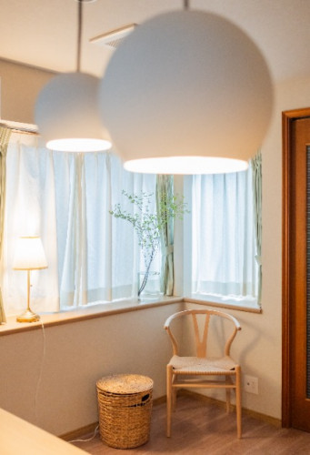 キッチンカウンター上には、大小異なるコロンとしたペンダントライトをアシンメトリーに配置。空間にリズムと可愛らしさを添えています。