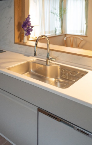 奥様がこだわった食洗機の位置は、シンク横で作業がスムーズ。片付けが一歩で完了する家事ラク設計に、とてもご満足いただきました。