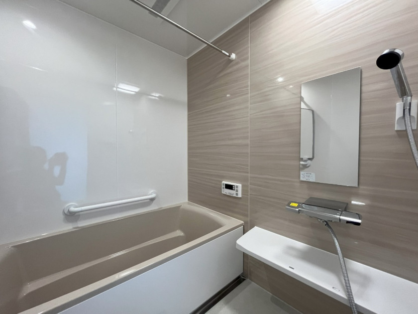 グランスパシリーズをチョイス。シャンプーや小物などは、カスタマイズが可能なマグネットアイテムで、浮かせる収納でごちゃつく浴室もスッキリおしゃれに収めることができます。