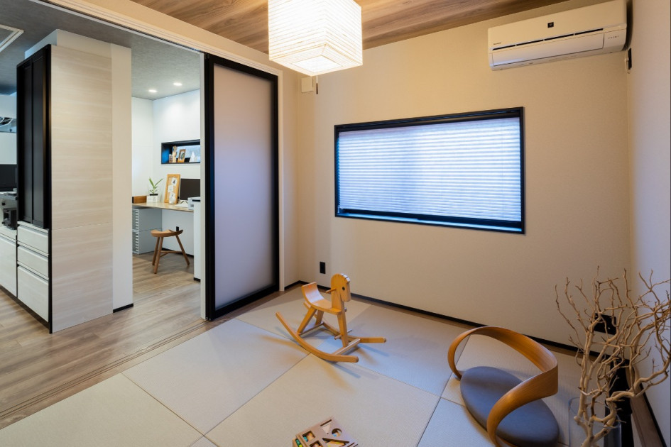 子供がおもちゃで遊んだり、お昼寝もできる和モダンな和室。