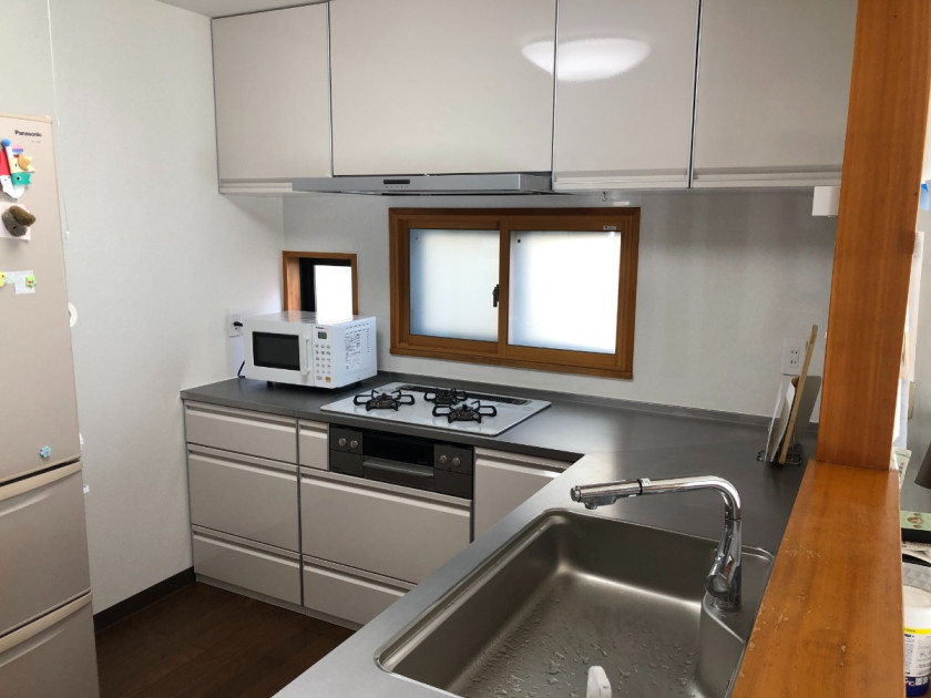 娘家族との同居を機に、キッチンをリフォームしました。もともとコの字型のキッチンだったため、コーナー部にデッドスペースができてしまい使い勝手が悪かったのですが、シンプルなL型キッチンとすることで、家事同線が良くなり、快適に使用できるようになりました。コーナー部にはスライド網カゴが付いており、奥まで快適に使えます。また、吊戸用昇降棚を設置したことで、吊戸棚も有効に使えるようになりました。