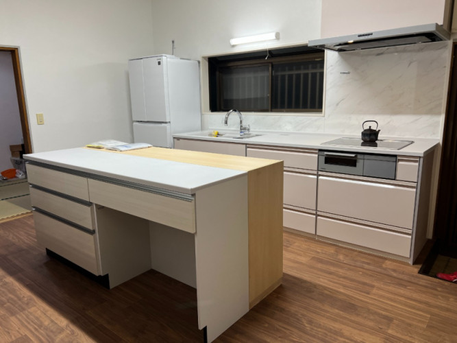 台所中央の作業台も造作したりして収納力を多くし、今まで使っていた天付け収納棚を床に置いたりと台所作業がゆったりできるような空間作りをしました。