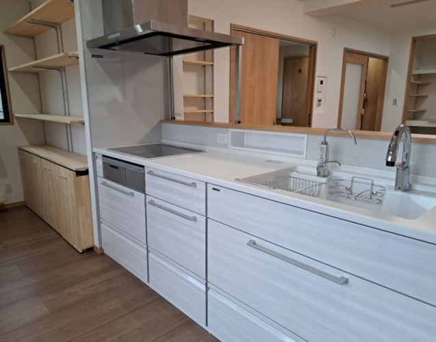 対面キッチンにしてリビングを見渡せるだけでなく、キッチンの調理台前に収納スペースを造作しました。