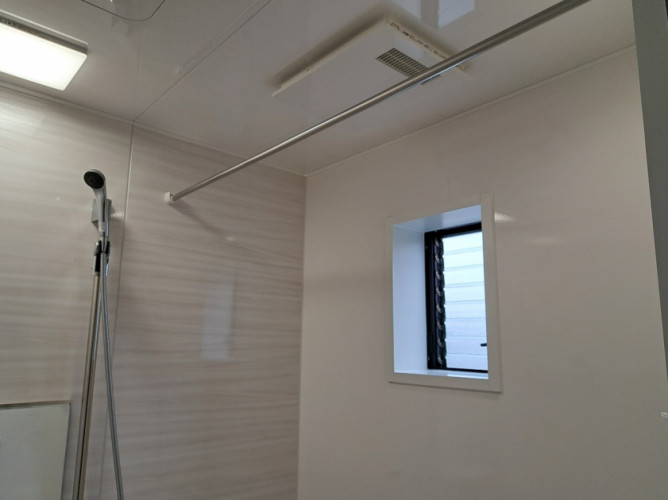 浴室に入るときの支えにもなるようシャワーフックのスライドバーを手すりタイプにしています。