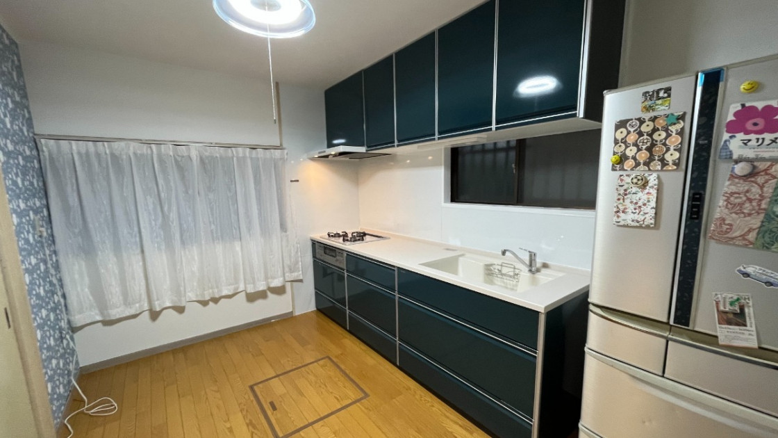 キッチンリフォームの際、パネルは、じゃんけんで勝ったご主人のラッキーカラーのグリーンを選びました。奥様ご要望の手動の昇降棚をつけています。