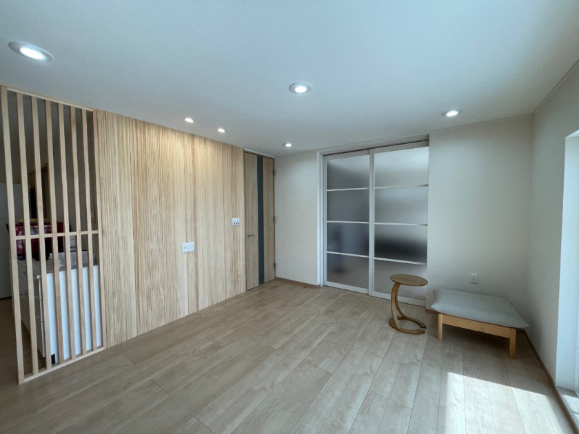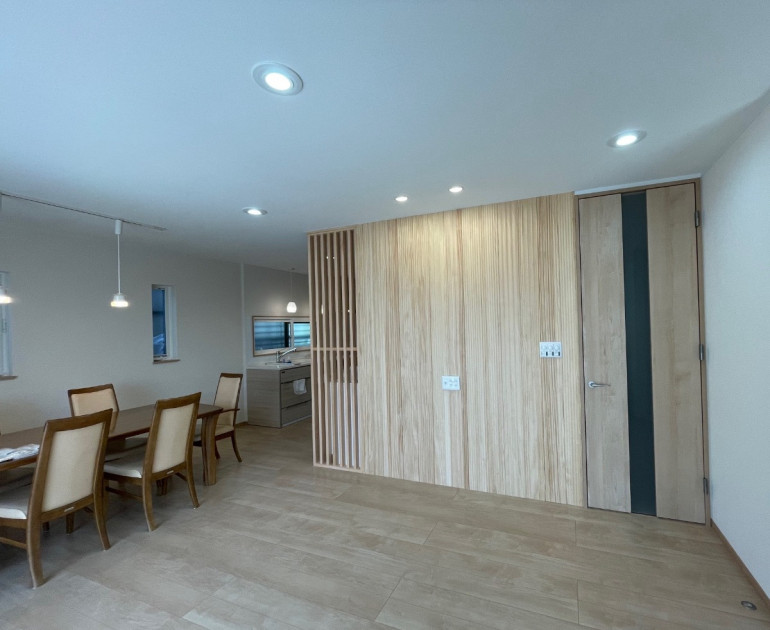 LDKと隣接する既設和室を将来のために洋室に改装しました。現在も将来も生活スタイルとしては、2室が連続性・開放性のある形であることが使い勝手が良いとのことで、開閉スクリーンパネル戸で自在に空間スタイルを可変できるようにしています。