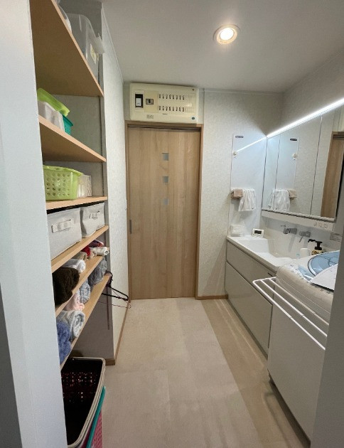 マット、洗濯用品や下着を常備しておける収納スペースがあると便利な事から、洗面室に隣接するお部屋の一部を利用して収納スペースを新設しました。