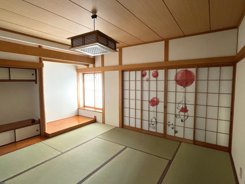 壁を明るく、障子を絵柄入りの物にリメイクすることで、楽しそうな空間に!