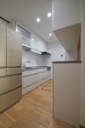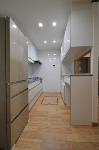I型+背面収納にレイアウト変更することに。画面正面の壁いっぱいにホーローパネルを貼りました。照明をダウンライトにすることですっきりとした印象に。新しいキッチンに合わせて床下収納庫の手前まで床暖房を敷設しました。