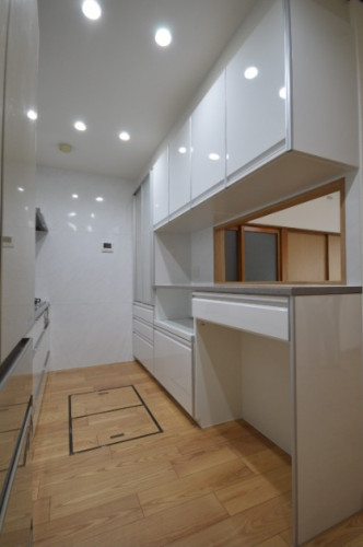 キッチンブースの中まで敷設されている床暖房があり、キッチンレイアウトに制限がありました。「どうせなら!」と傷みが出てきたフローリングと、床暖房もリフレッシュすることでキッチンレイアウトに自由度が出ました。I型、Ⅱ型、L型と、納得がいくまでいくつものプランをご検討いただきました。