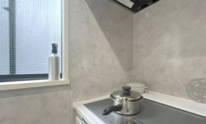 淡いグレーのもやっとした模様がランダムに広がり、白でキリッとした空間にやさしい抜け感をプラス。硬すぎず、ほわっと柔らかな雰囲気に仕上がりました。