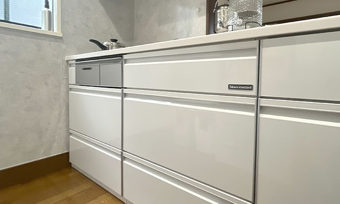 開き戸が多く、収納力や作業効率に課題があったキッチンは、タカラスタンダードのシステムキッチン「トレーシア」にリフォーム。耐久性の高いホーローで汚れや水に強く、お手入れも簡単です。