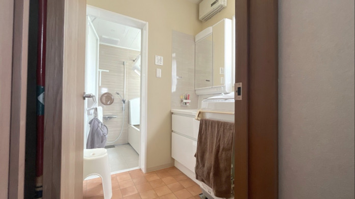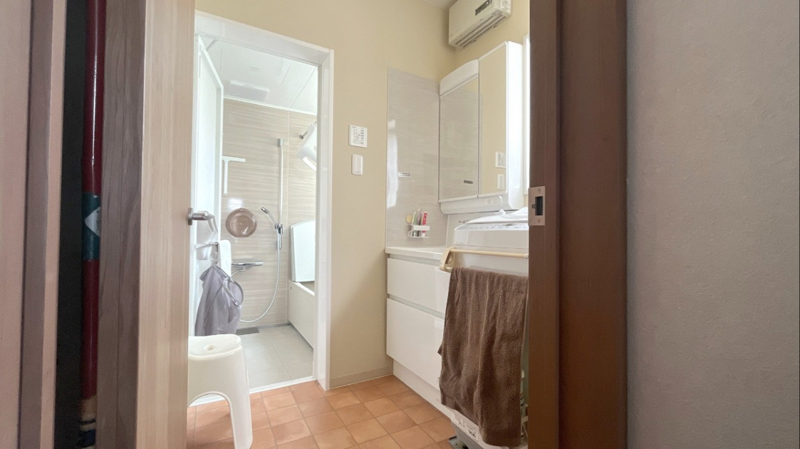 壁はやさしいベージュ、床はオレンジのタイル風デザインで、朝の支度も気分よくできるあたたかみのある空間です。