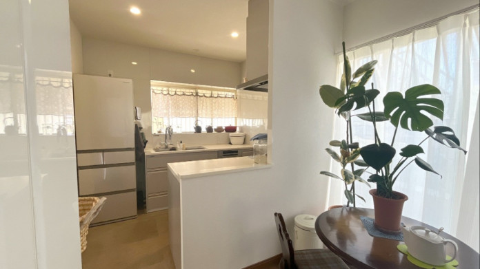 レイアウトを一新し、窓側にシンクと作業台、向かいにIHと広い作業スペースを配置。見通しの良い並列型で動線がスムーズに。キッチンパネルでお手入れも簡単に。隣のスペースは造作収納とダクトレールライトを備えた植物コーナーに生まれ変わり、明るくナチュラルな空間に。