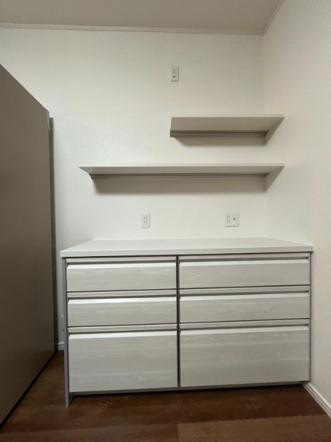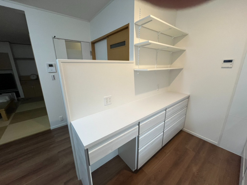 キッチン、カップボードと同色のテレビボードも設置させていただきました。