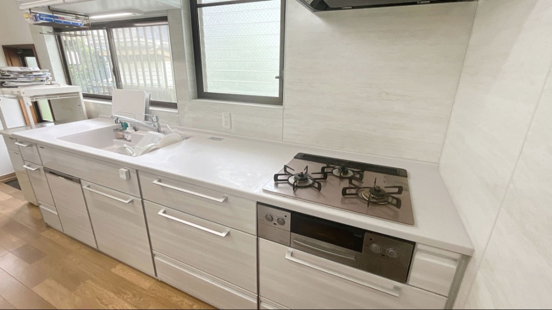 キッチンパネルには、一枚が大きいためパネル同士の継ぎ目が目立たないエマウォールを使用。インテリア性もありつつ、光も反射して明るく、掃除も簡単に。