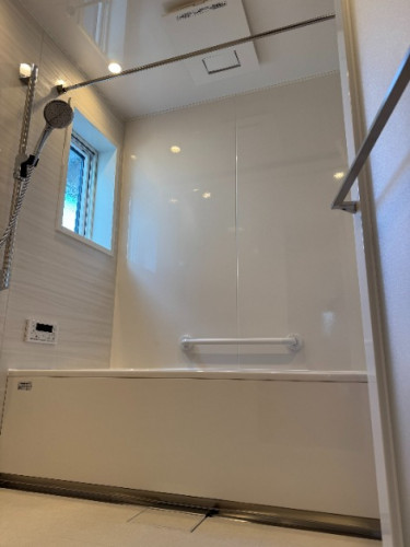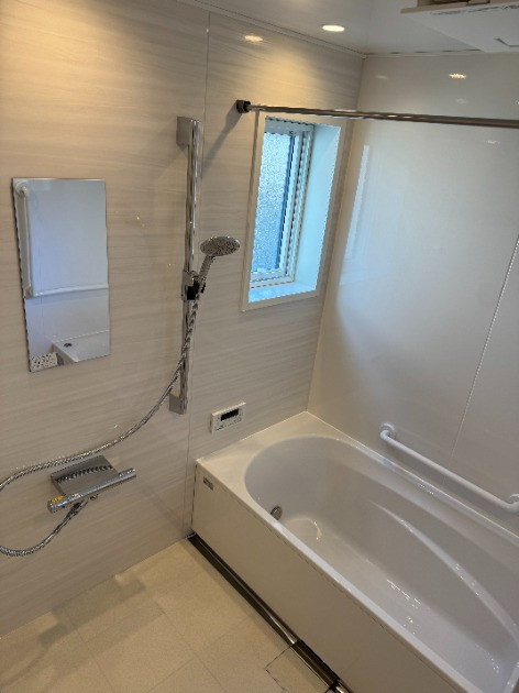 1618サイズに狭くしましたが、ホワイト基調のコーディネートで狭さを感じさせません。ユニットバスまるごと保温に加え、現代基準の断熱サッシに交換したことで寒さを感じない新しいお風呂になりました。