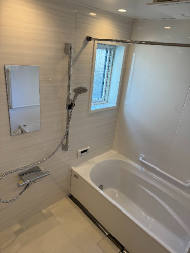 今までの浴室は1.25坪。広々とした浴室で、それはそれは快適でした。しかし年月が経るごとにお掃除が大変になってきたことも事実。そろそろリフォームを検討するにあたり、メーカー選定もさることながら広さも悩みどころでした。ご夫婦で、お掃除する面積が少ない1坪にするか今まで通りの広さにするか意見が分かれましたが、長年連れ添ったご夫婦、間を取って「1618」サイズに落ち着きました。掃除がラクな磁器タイル床、ホーローパネル、アクリル人造大理石浴槽・・・これからが楽しみです。