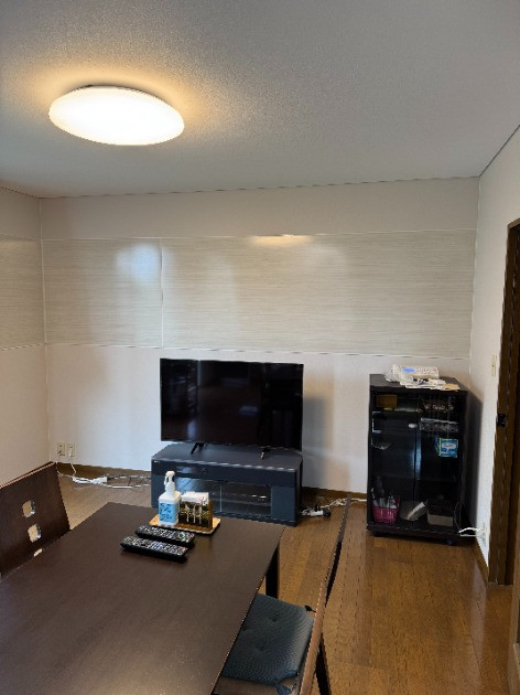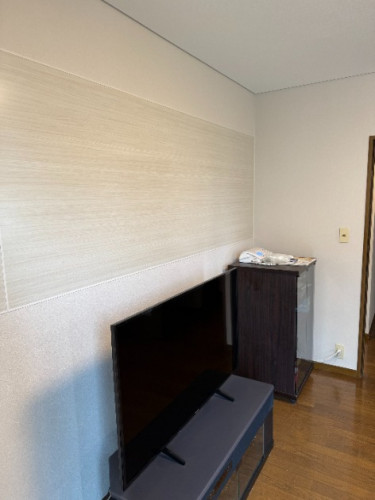 画像では少し分かりづらいのですが、全面ではなく部分的に配置しています。テレビに隠れないよう、貼付け箇所を入念に打ち合わせを行いました。