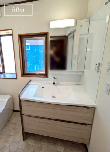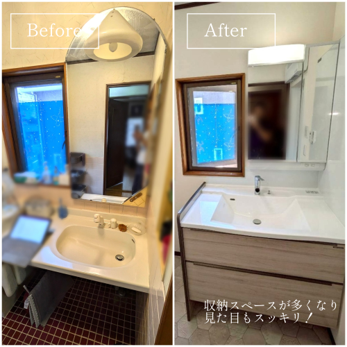 より広く使えるように、洗面台横にある収納を解体し収納たっぷり、家事ラクな「タカラスタンダード」を採用!ミラー裏や引き出しタイプの収納力のある洗面化粧台に入れ替えたことで、タオルや日用品もすっきり収まり、使いやすさが格段にアップしました。歯ブラシや化粧品などの小物類をすっきり整理でき、見た目も美しい空間に仕上がります。鏡のみファミーユを採用し台はエリーナを採用しました。
