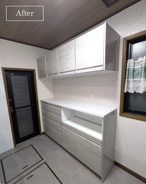 お掃除のしやすさとキッチン収納を増やしたいというご要望をいただきました。また、「下がり壁を撤去して空間を広く見せたい」とのご相談もございましたが、梁があるため、全て撤去はできませんでした。その中でも可能な限り施工を行い、以前より広く、そして明るく感じられるキッチンへと生まれ変わりました。背面収納にはコンセントを増やし、より便利に使用できるようになりました。