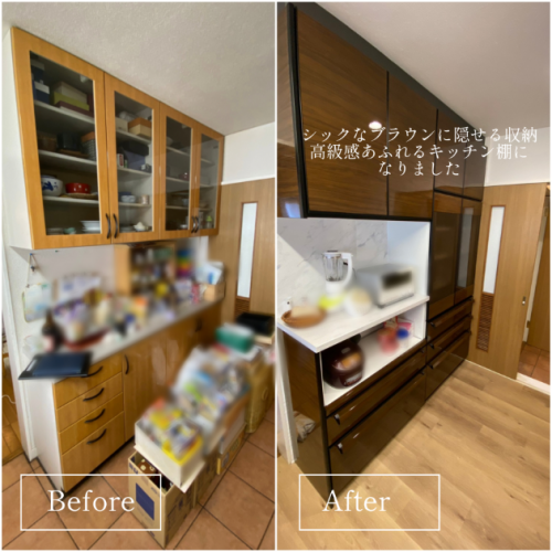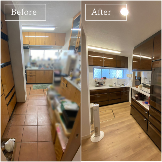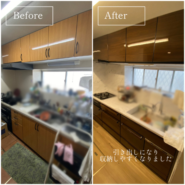 作業台を低くし、掃除がしやすく収納スペースを増やしたいとのことでしたので「タカラスタンダード / レミュー」をご提案。なんとタカラ史上最⾼収納⼒を持つキッチン!!また清掃性についても主要部はホーロー素材になっており汚れが落ちないことがありません。お掃除が大変な換気扇までホーロー!家事ラク、収納力抜群なキッチンに!また、今回は「キッチン・収納棚・床張り替え・内装・照明」と丸ごとリフォームしたので一気に雰囲気も変わりました。