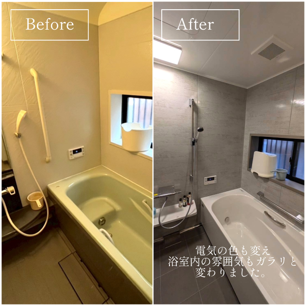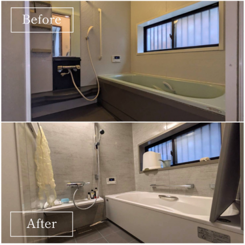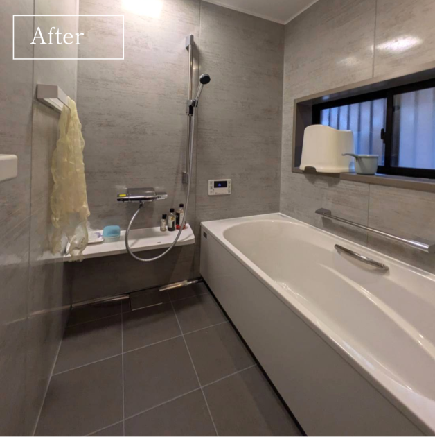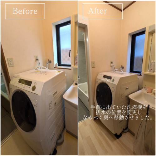 浴槽が割れており、日々浴槽の割れが酷くなっていると感じているとの事でしたので丈夫なタカラスタンダードをオススメ!お肌が弱いということで、マイクロバブルがお湯に溶け込むうるぽか湯を設置。追加でドラム式洗濯器が排水の位置の関係で前に出てきてしまっているので、排水の位置変更をしなるべく奥へ移動しました。
