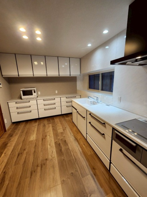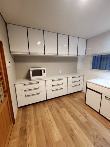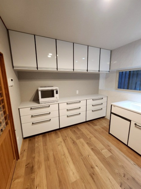 現地調査にお伺いし、収納がしずらいのが問題でした。ショールームに何度か同行していただき、3Dパースを作成し納得いくまでお客様とプランを考えました。キッチンのレイアウトを大幅に変更し、カップボードの配置も同時に考えプランさせて頂きました。床の仕様、内装材までトータルでお客様と一緒に考えて、とても良い空間になったと思います。