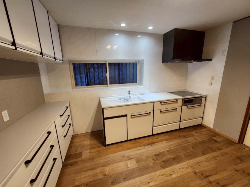 キッチンの面は統一感を持たせる為、ホーローキッチンパネル貼りにしました。