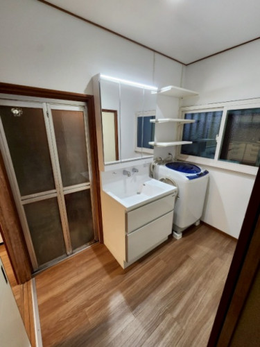 既存の洗濯機と洗面化粧台の配置が悪く、使いにくいスペースでした。配置を変える事で、空間を有効活用できるように施工させて頂きました。