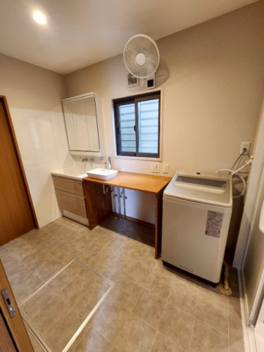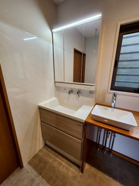 洗面所は洗面化粧台の入替えと同時に、お客様のご要望をあり洗面台の横にカウンターを造作し、洗面ボウルを設置しました。ほとんどのお客様も経験があると思いますが、「けっこう洗面台を使うタイミングって家族で重なりますよね」