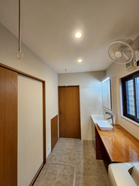 それから、壁掛け扇風機を設置し、お風呂上りに使用できるようにしたり、ホスクリーン(洗濯物干し)を取付させて頂きました。扇風機とホスクリーンで室内干しもいつでもできるようにプランさせて頂きました。